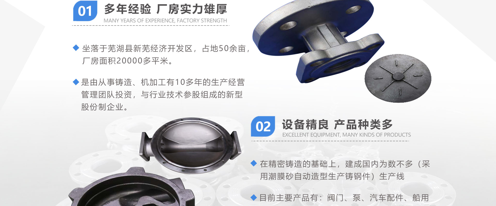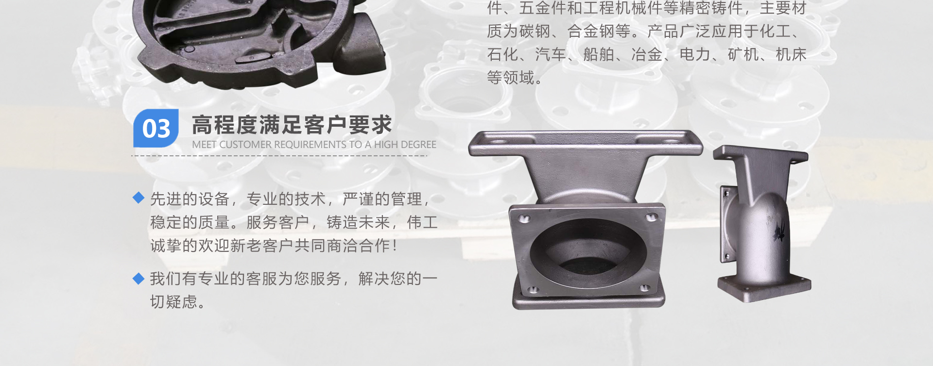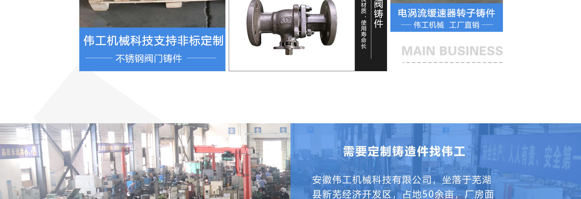 安徽偉工機械科技有限公司,坐落于安徽蕪湖新蕪經(jīng)濟開發(fā)區(qū),是一家専業(yè)從事鑄造產(chǎn)品設(shè)計、研發(fā)、生產(chǎn)、銷售于一體的企業(yè),公司為客戶的產(chǎn)品提供多樣的技術(shù)支持與設(shè)計,公司主要鑄造技術(shù)有潮模砂鑄造、硅溶膠精鑄工藝。主要產(chǎn)品有:不銹鋼閥門配件、泵閥配件、汽車配件、工業(yè)管道配件、工程機械配件、汽車配件等。材質(zhì)為:低合金鋼、304、316、316L、鉻鉬鋼、哈氏合金、碳鋼、雙相鋼等。公司已先后通過ISO9001和TS16949等多種體系審核,以完備的管理手段和齊全的檢測設(shè)備滿足客戶需求,進的設(shè)備,専業(yè)的技術(shù),嚴謹?shù)墓芾恚€(wěn)定的質(zhì)量。服務(wù)客戶,鑄造未來,偉工誠摯的歡迎新老客戶共同商洽合作